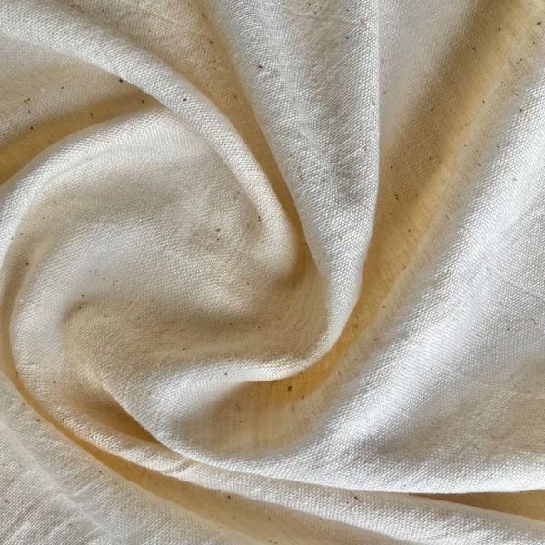 This khadi cotton fabric is a handwoven fabric made from cotton. It is highly breathable and comfortable to wear. It is the best option to wear in the summer due to its lightweight and airy features. This fabric is ecru, the original color of cotton. It is chemical-free and sustainable in nature. It is used in shirts, dresses, skirts, trousers, sarees, accessories, and home textiles.
