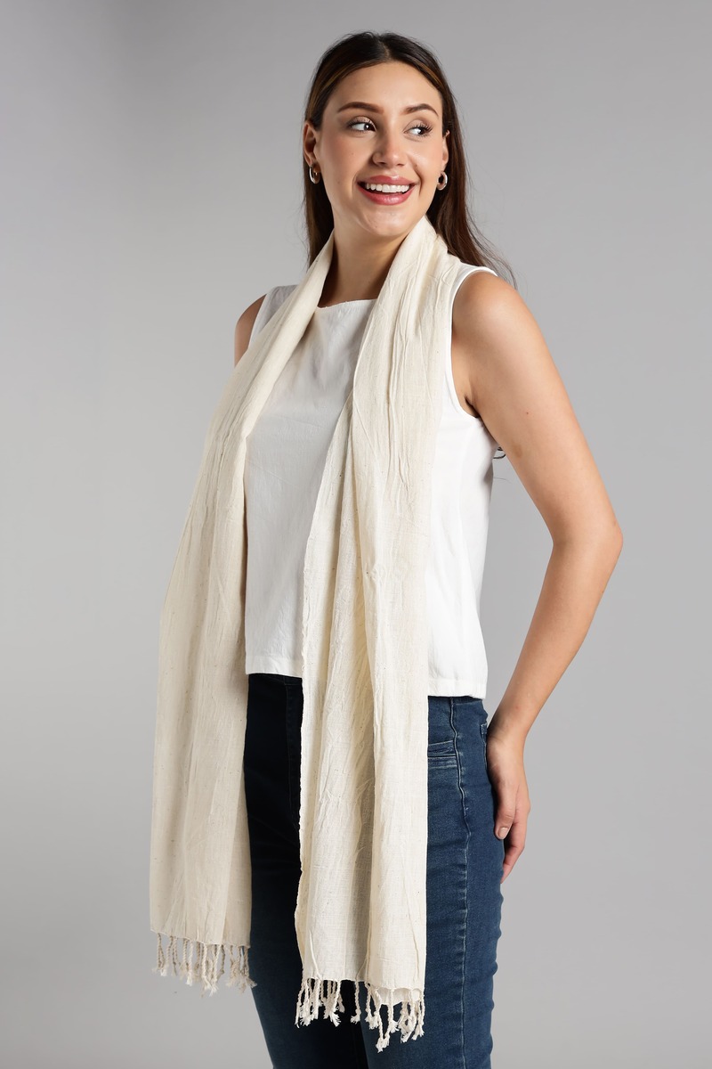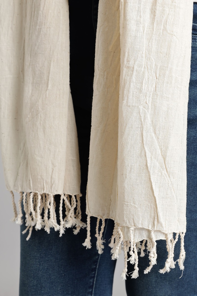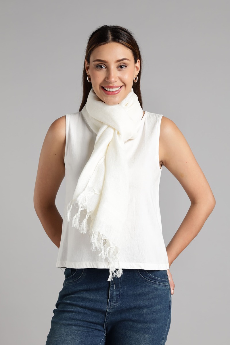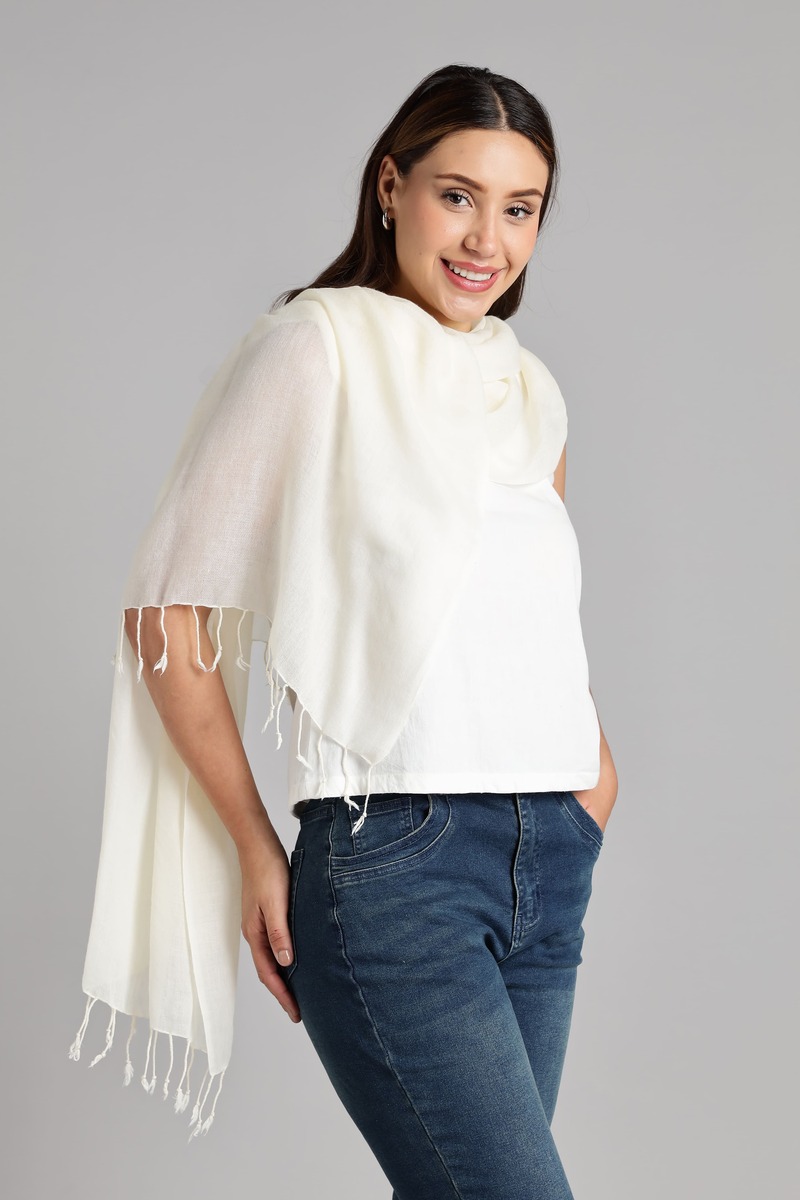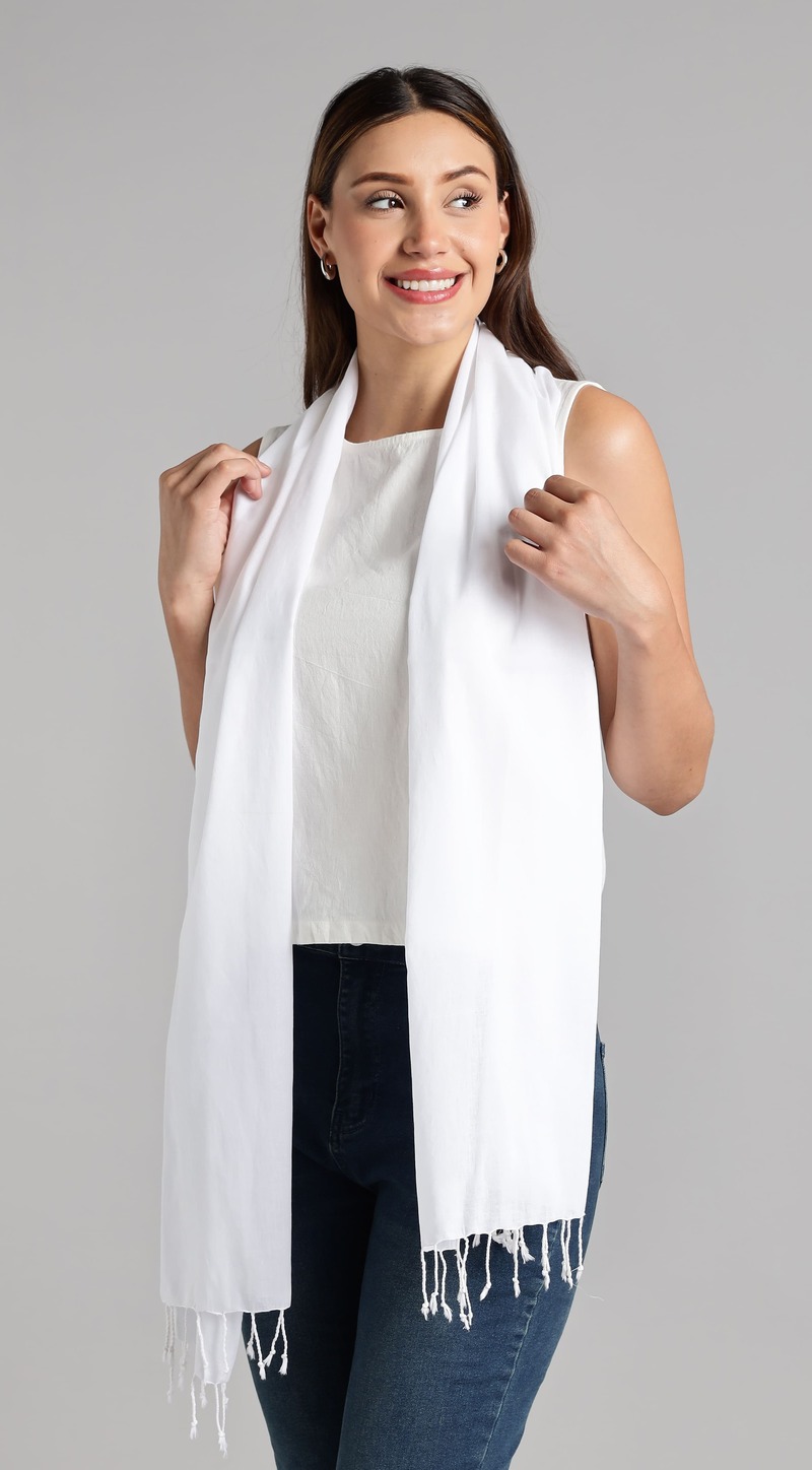 This cotton voile scarf (Ref-Ritu) is lightweight, ready to dye, and soft in texture. It is made of 100% cotton. It can be an accessory used during spring and summer. The soft cotton voile fabric ends with fringes, and it will match most of your outfits. You can wear it as it is in white or dye it with any natural colors.