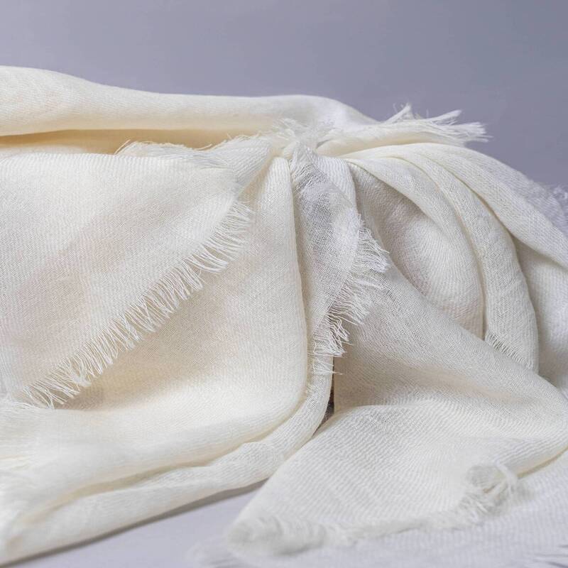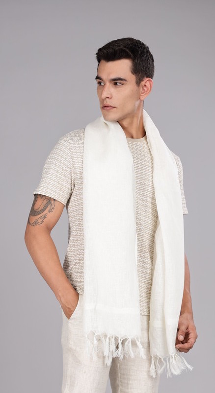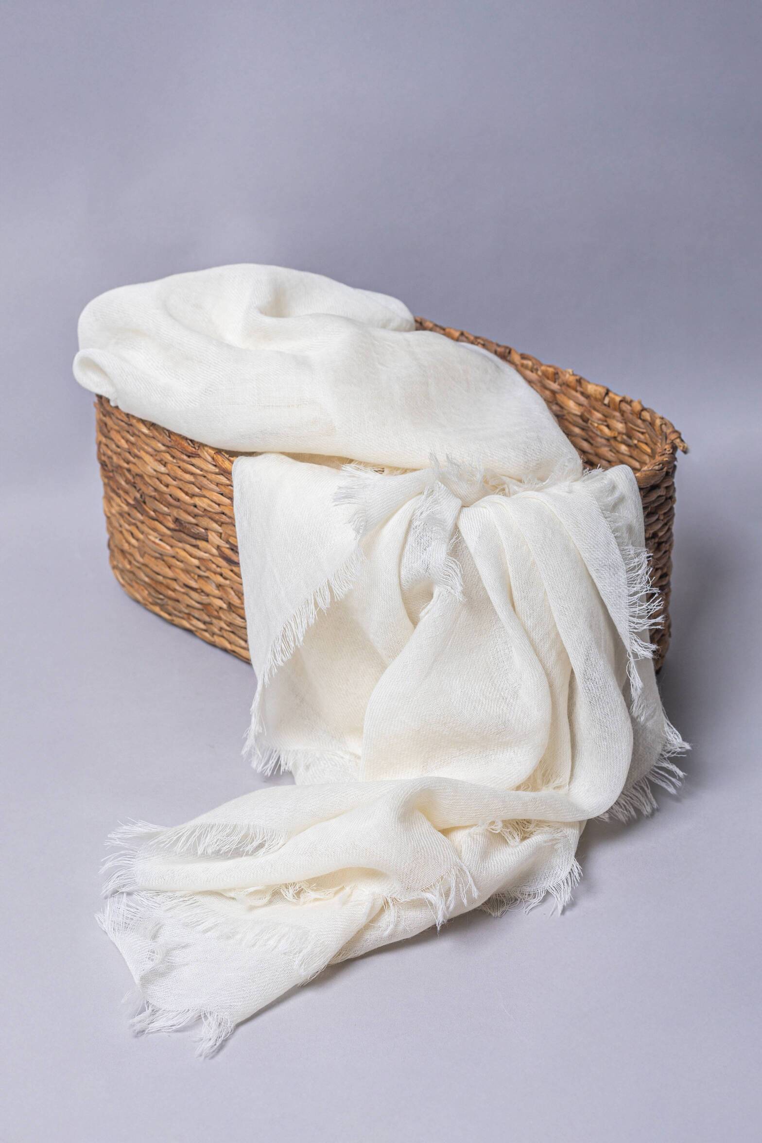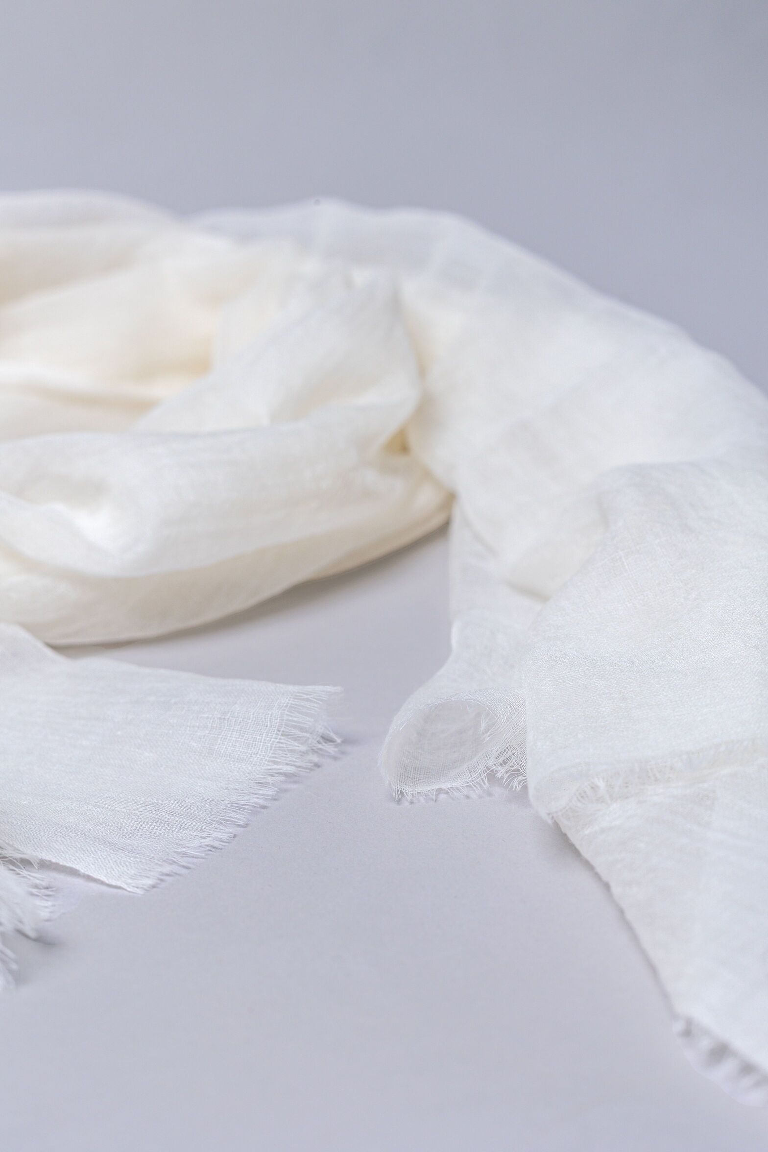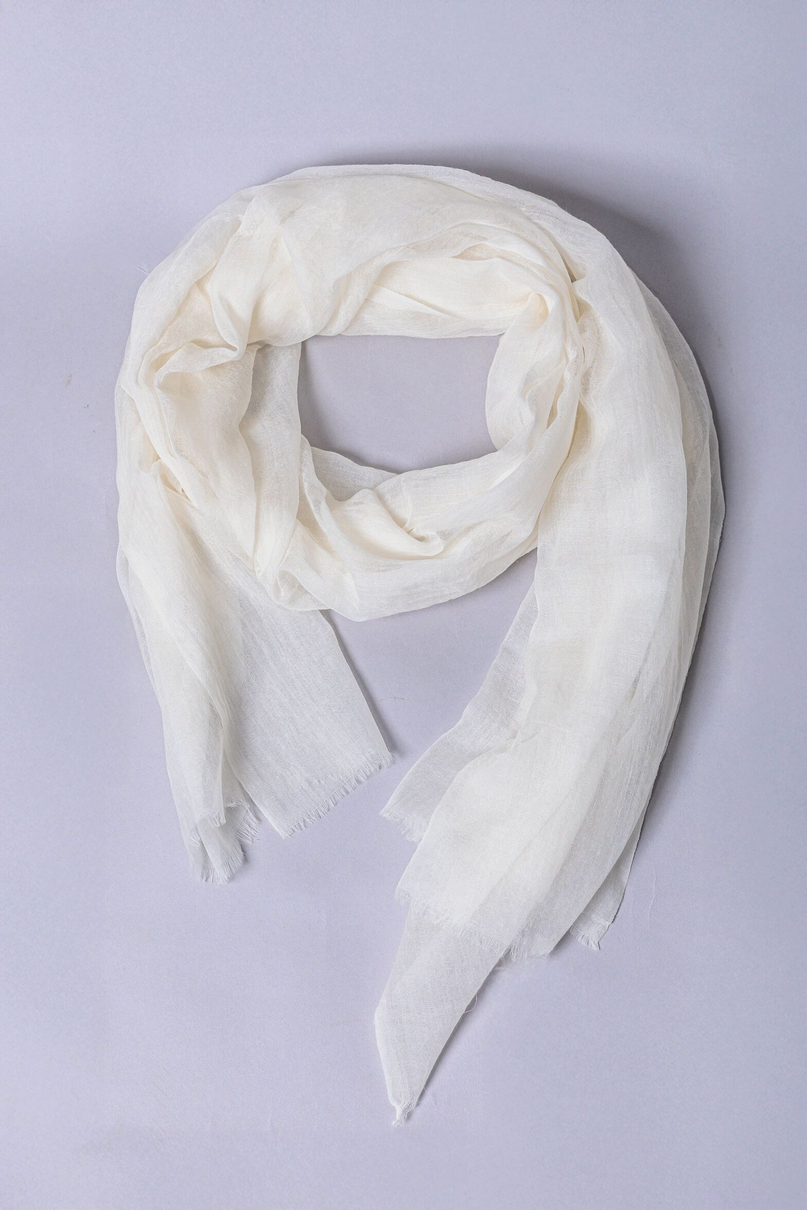 Our linen scarf (Ref Aman) is made from 100% linen. It has a breathable feel and is very comfortable while adding a natural touch to your look. The white linen scarf has a lightweight texture, and the fabric used is ready to dye with natural colors. You can very easily dye or print this product if you wish to customize it.