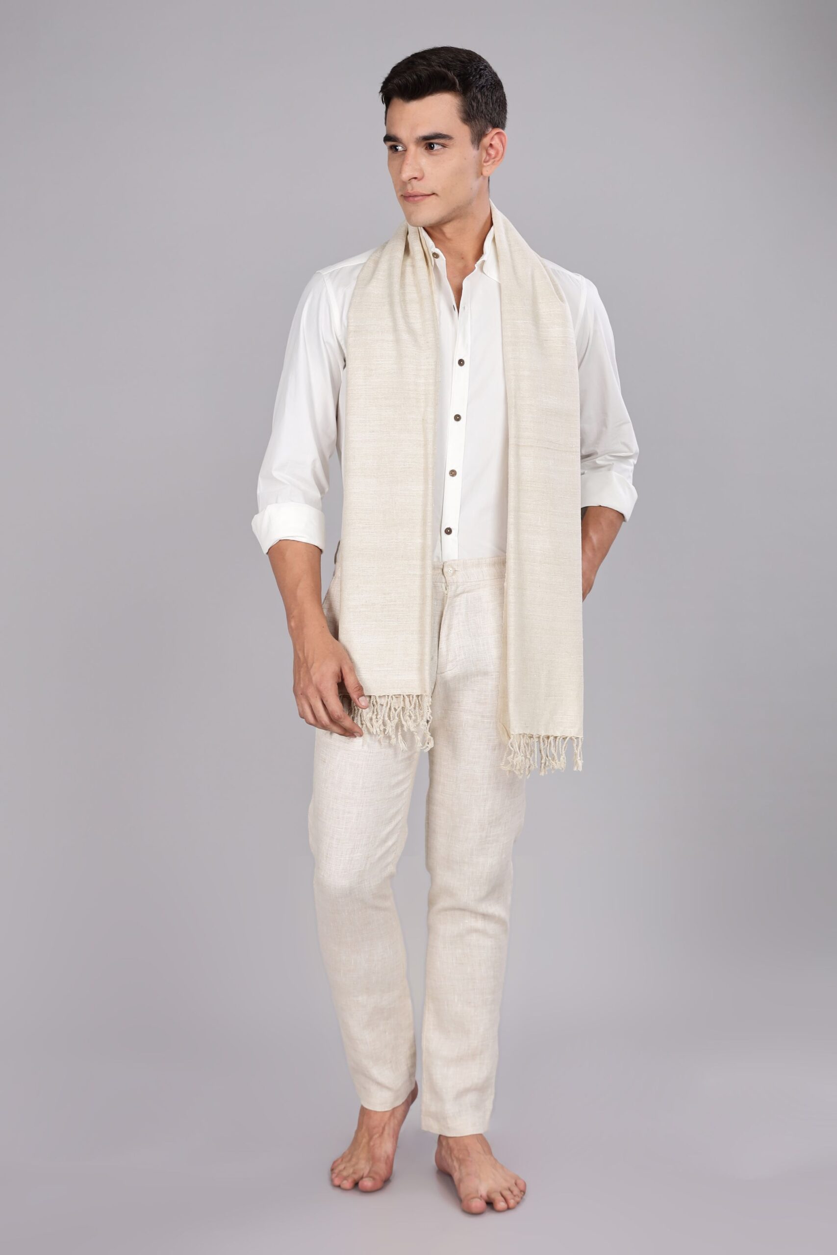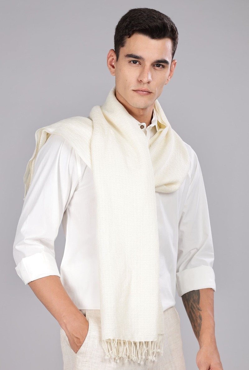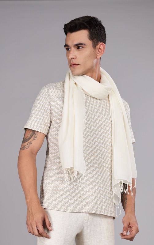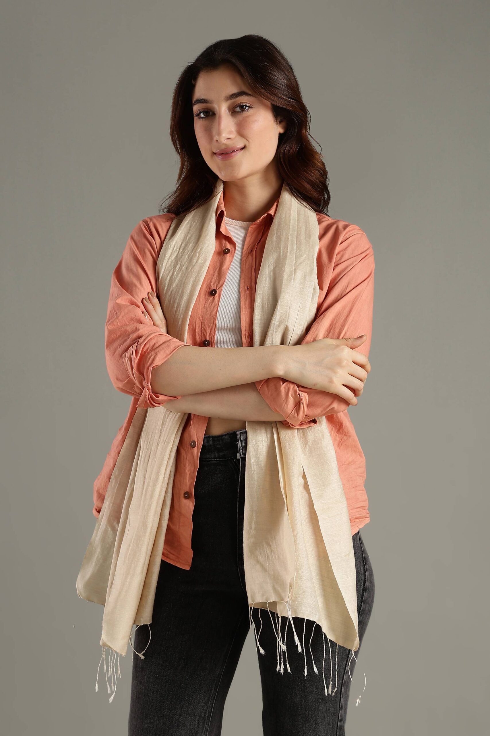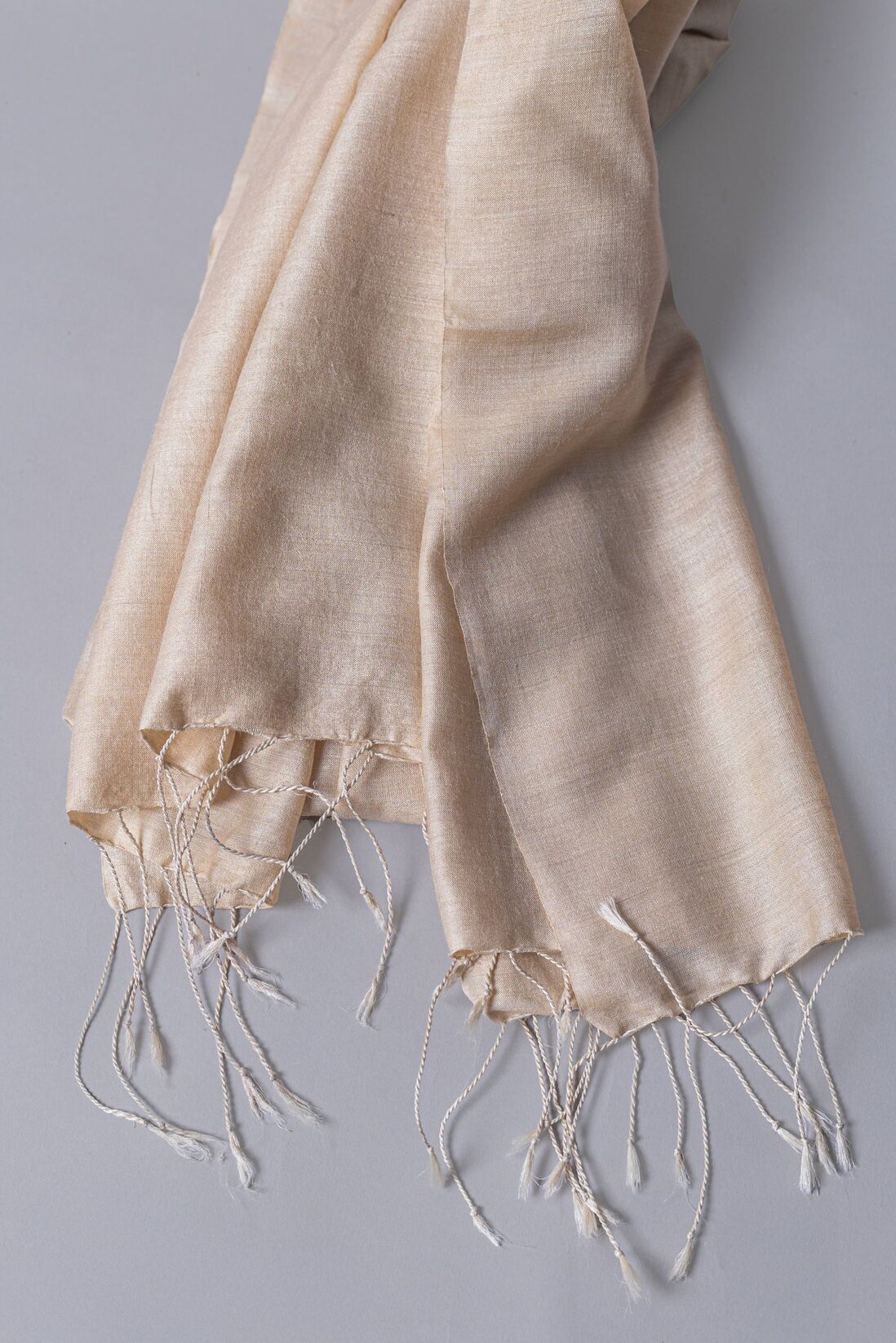 This muga silk scarf is crafted from premium-quality fine silk, which feels soft and smooth. It has a natural shine and is light to wear. The scarf is handwoven and handspun by skilled workers using genuine Muga silk. It is finished with delicate fringes at the ends with a silk thread. The scarf features a natural golden color that complements many outfits beautifully.