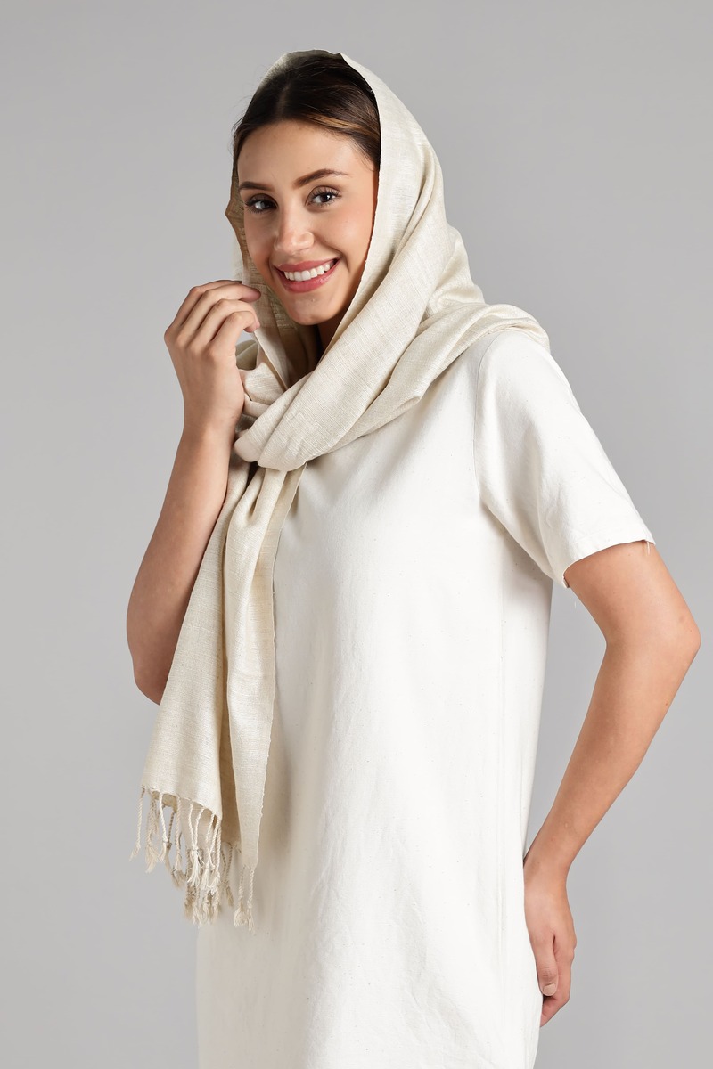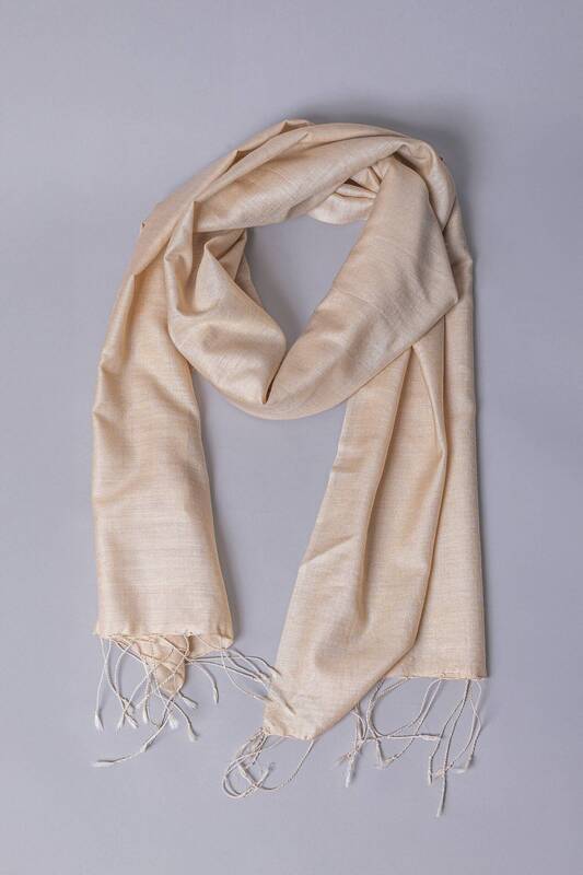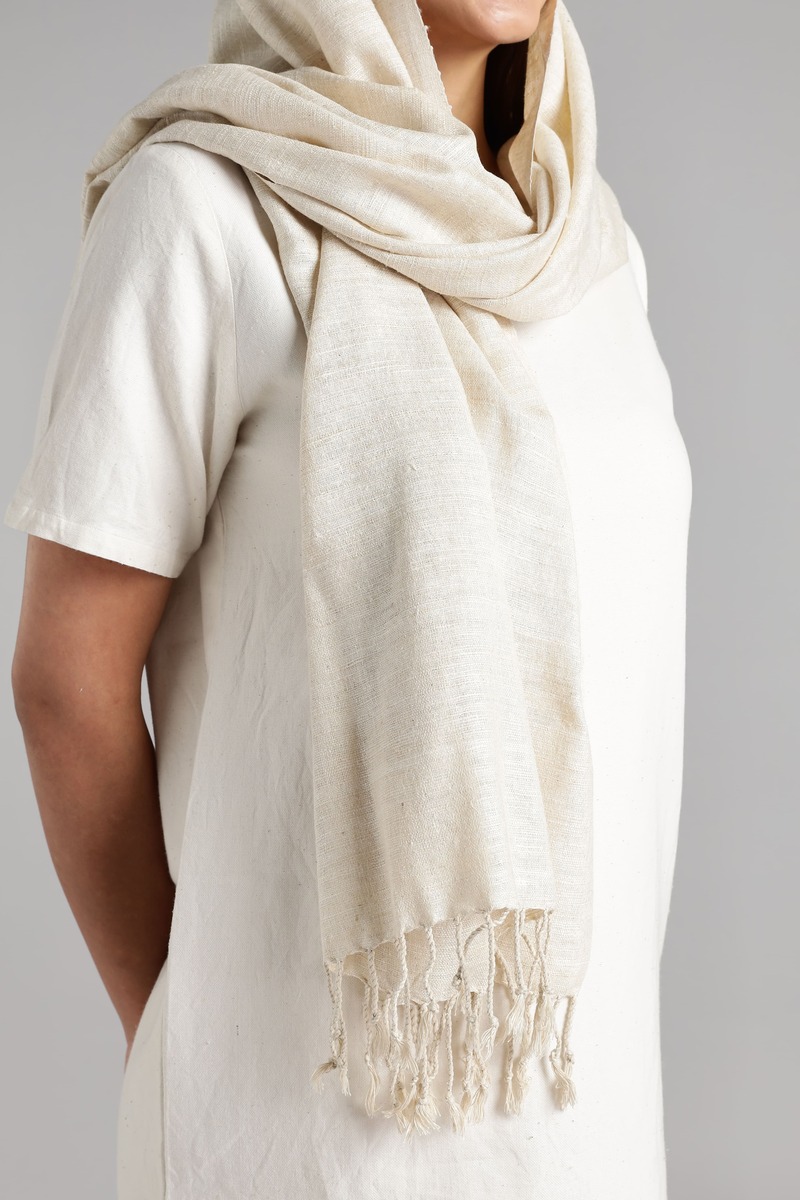 This beautiful hand-spun, hand-woven scarf (Ref-Sahana) is crafted from 100% wild silk fiber, also named as peace silk. Unlike regular silk, a wild silk scarf gives a much more textured feel. It is easily dyeable, and each piece is unique. It is beige/ecru. If you wish to naturally dye this ahimsa silk, do so properly in order to remove any extra natural oil residue due to hand-spun work.