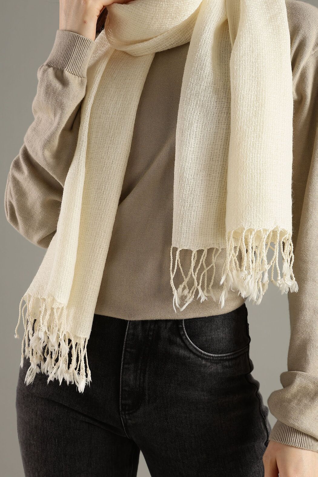 The scarf is made of very fine merino wool that is soft and smooth. The scarf is finished with small eyelash fringes at the ends, which give it a great look. This fine wool feels soft against the skin, a quality that is rare to find in most wool fabrics. It can absorb natural dyes very beautifully.