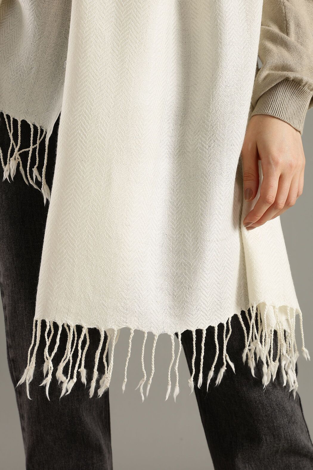 This scarf (Ref. Nidhi) is made using 85% wool and 15% silk. The wool gives you warmth, and the silk properties, being light but also very warm, are a perfect combination, also increasing the softness of this product. You will appreciate the beautiful woven design of this wool-silk blend scarf.