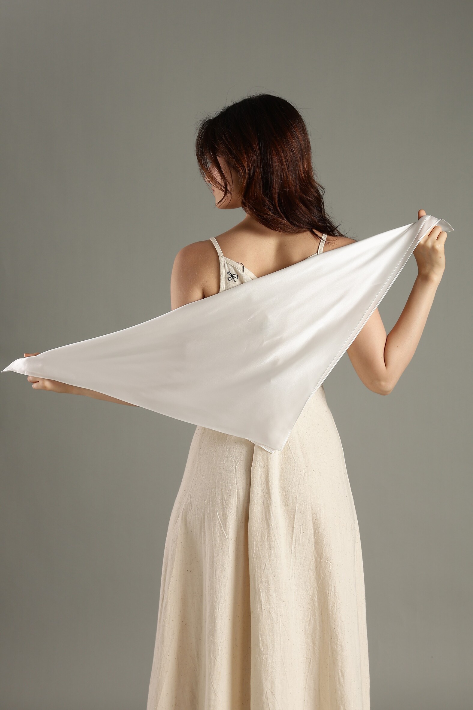 The silk square is made from satin 60, which has a soft and smooth texture. The edges are neatly finished with 100% silk thread, and the fabric drapes beautifully. It has a shiny appearance on its fabric surface that gives it a refined look. You can wear it as a headscarf, necktie, or bag accessory. As it is ready to dye, you can customize it according to your specific needs.