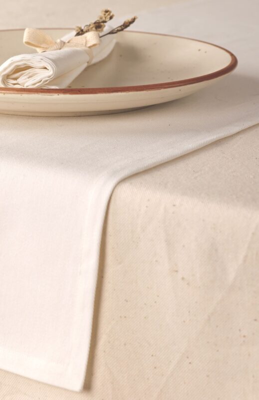 This table runner can be used for long tables of up to 6 to 8 seats. You will appreciate the beauty of the drill fabric used. It is a 100% organic cotton, naturally whitened, chemical-free, and dye-free product. The hem is stitched with cotton thread. This cotton table runner can be used as it is or customized with various techniques.